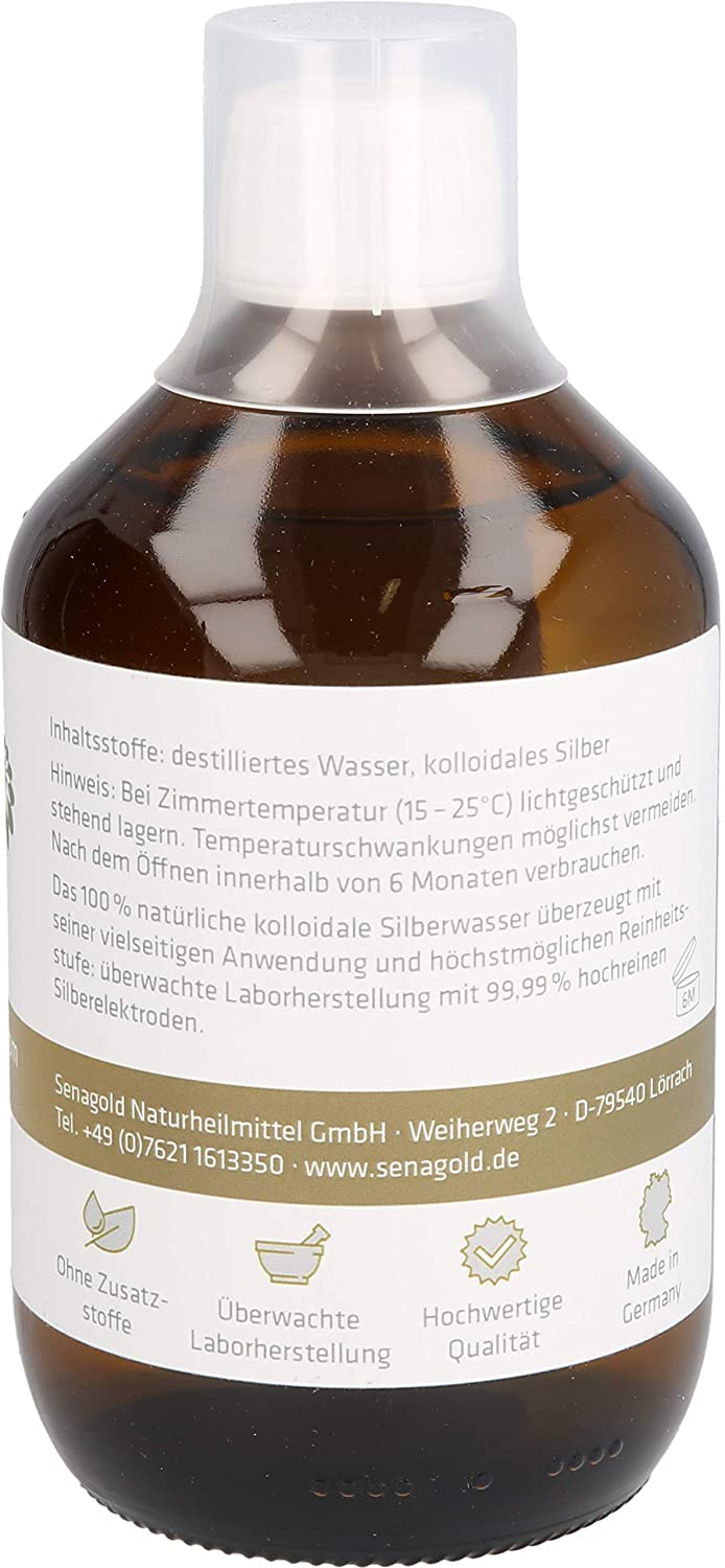 Kolloidales Silber von Senagold überzeugt mit seiner vielseitigen Anwendung und höchstmöglichen Reinheitsstufe, hergestellt mit 99,99% hochreinen Silberelektroden in einem etablierten Elektrolyseprozess. ÜBERWACHTER LABOR-HERSTELLUNG: gesicherte Qualität aus überwachte Laborherstellung in Deutschland - made in Germany HOCHWERTIGKEIT: ein aufwendiges Herstellungsverfahren mit > 99,99% reinen Silberstäben TOP-QUALITÄT von Senagold: Seit 2008 Ihr Naturheilmittel Anbieter aus Deutschland mit gesicherter Qualität zu fairen Preisen Warum sollten Sie sich für kolloidales Silber von Senagold entscheiden?Kolloidales Silber von Senagold überzeugt mit seiner vielseitigen Anwendung und höchstmöglichen Reinheitsstufe, hergestellt mit 99,99% hochreinen Silberelektroden in einem etablierten Elektrolyseprozess. Inhaltsstoffe: destilliertes Wasser, kolloidales Silber Lagerung: Bei Zimmertemperatur (15 – 25°C) lichtgeschützt und stehend lagern. Temperaturschwankungen möglichst vermeiden. Haltbarkeit: Nach dem Öffnen 6 Monate haltbar. Kolloidales Silber von Senagold garantiert: Ohne Zusatzstoffe Überwachte Laborherstellung Hochwertige Qualität Made in Germany